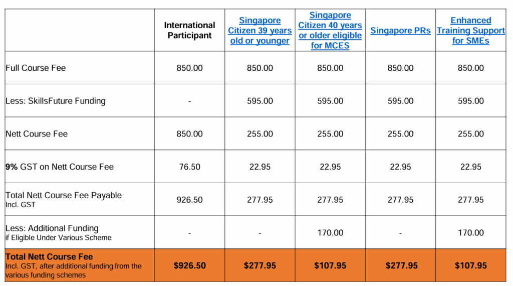 | Total Nett Programme Fee after 9% GST + additional funding from the various funding schemes | S$926.50 | S$277.95 | S$107.95 | S$277.95 | S$107.95 |