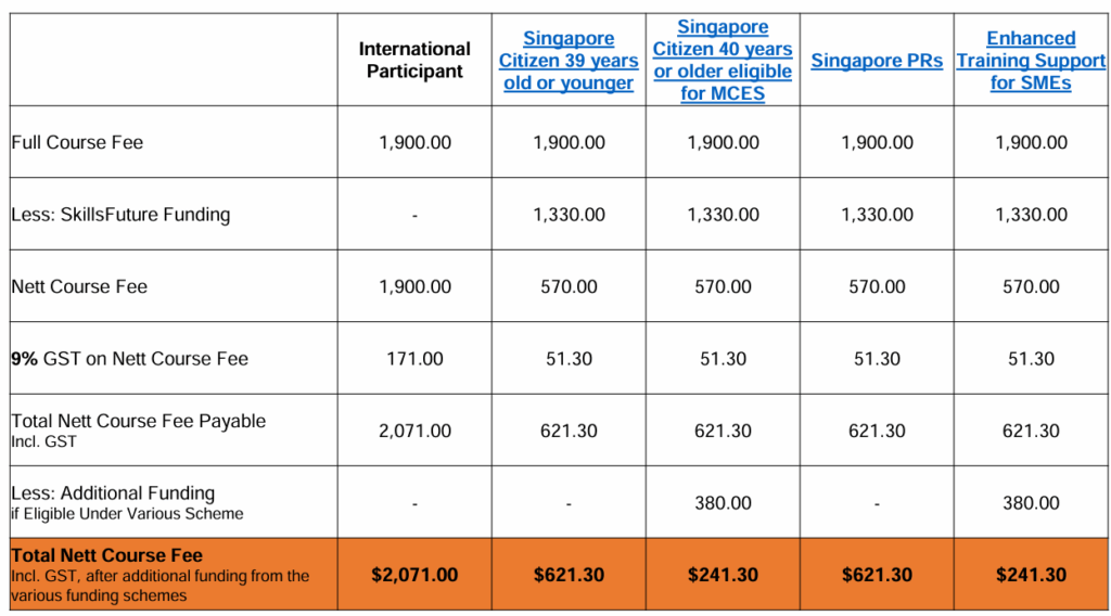 | Total Nett Programme Fee after 9% GST + additional funding from the various funding schemes | S$2,071.00 | S$621.30 | S$241.30 | S$621.30 | S$241.30 |